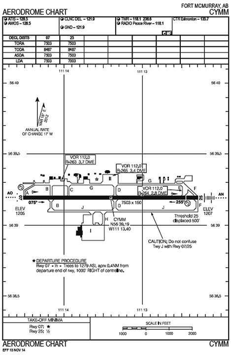 - On 13 November 2014 a CAUTION was added to the CAP Aerodrome Chart for CYMM to warn IFR pilots: “Do not confuse Twy J with Rwy 07/25.”