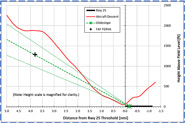 Approaching 3000 feet asl, MPE9131 was 2.5 dots above the glide slope as indicated on the glide slope deviation bar at 140 knots indicated airspeed . The autopilot was engaged and the mode control panelFootnote 5 for the aircraft had been configured for “altitude acquire” and the altitude select set to 3000 feet. The approach mode was armed with the localizer captured and the autothrottle set in speed mode on the mode control panel. At 1836:28, given the autopilot settings, MPE9131 levelled off at 3000 feet asl just prior to the final approach fix PERVA, which was not planned for by the flight crew. The autothrottle increased thrust to maintain the selected speed (Appendix B).