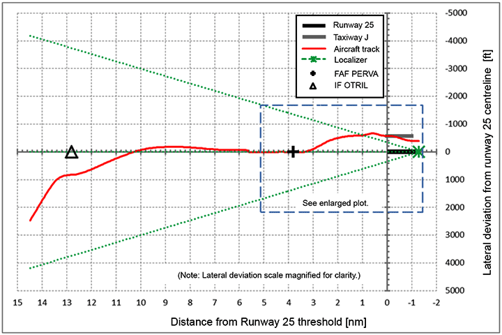 At 1837:57, the aircraft position was descending through 1.4 dots below the nominal glide slope, and the enhanced ground proximity warning system initiated a glide slope alert. Lateral deviation was 1.9 dots to the left and still increasing, as the aircraft was now on a track toward Taxiway J rather than the centreline of Runway 25. The glide slope alert ended at 1838:11, with the aircraft still 1.6 dots below the nominal glide slope, and lateral deviation 2.6 dots to the left, approaching full deflection. The crew requested that the CYMM tower controller confirm that the runway was clear at this time. The tower controller responded that it was.
