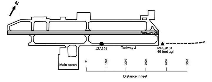 At 1838:21, when it became clear to the crew of MPE9131 that the aircraft was lined up with Taxiway J, the crew initiated a go-around when the aircraft was at 46 feet agl (Figure 2), and, 2 seconds later, the aircraft crossed abeam the threshold of Runway 25, 2800 feet away from JZA391. When MPE9131 overflew JZA391, it was 230 feet above JZA391, and climbing.