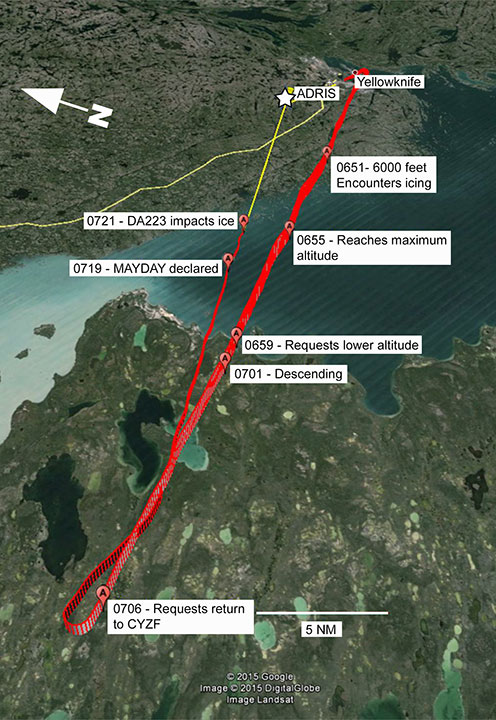 DA223 departed CYZF at approximately 0642, with an IFR clearance to 8000 feet above sea level (asl) direct to CYFS. During the climb, the aircraft encountered cloud layers; at approximately 0651, flying through 6000 feet asl, it encountered icing conditions. The aircraft continued to climb and levelled off at 8000 feet asl, where cruise power was set. The airspeed did not accelerate beyond 120 knots indicated airspeed (KIAS), and DA223 began to descend with cruise power set.Footnote 3 At 0659, the pilot contacted the Edmonton, Alberta, Area Control Centre (ACC) and requested a lower altitude, as he was unable to maintain 120 KIAS. Edmonton ACC cleared DA223 to 6000 feet asl direct to CYFS. During the controlled descent, airspeed continued to decline below 120 KIAS, even with the application of maximum continuous power. At 0706, a request was made to Edmonton ACC to return to CYZF because of severe icing. DA223 was ultimately cleared to CYZF via ADRISFootnote 4 at 3000 feet asl. At approximately 0710, the pilot advised the Air Tindi system operations control centre, using a company frequency, that DA223 was returning to CYZF, with an estimated time en route of 30 minutes.