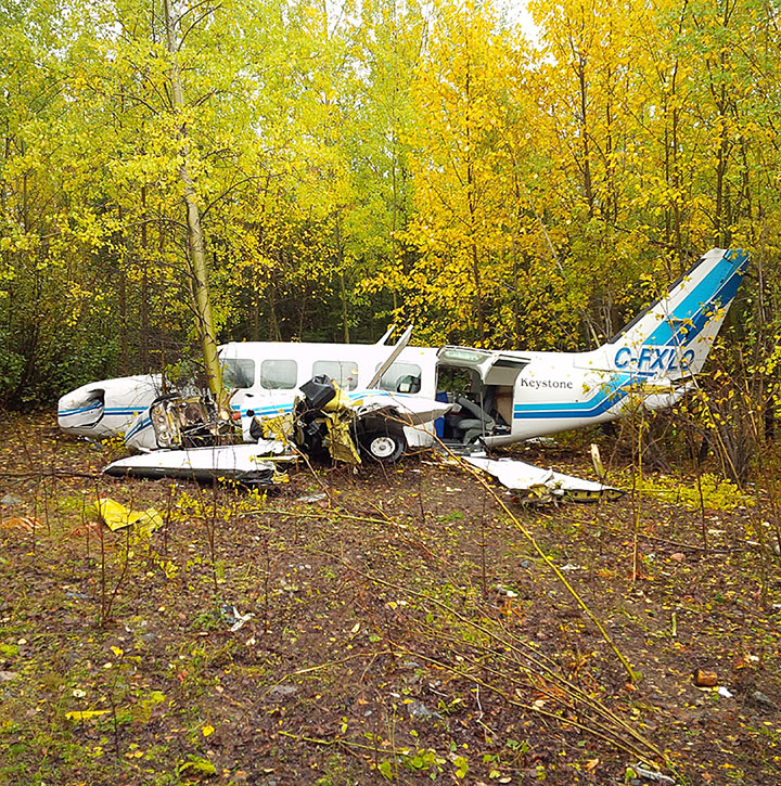At 1817 Central Daylight Time, the Keystone Air Service Ltd. Piper PA-31-350 (registration C-FXLO, serial number 31-8052022) departed Runway 06 at Thompson Airport, Manitoba, on an instrument flight rules flight to Winnipeg/James Armstrong Richardson International Airport, Manitoba, with 2 pilots and 6 passengers on board. Shortly after rotation, both engines began to lose power. The crew attempted to return to the airport, but the aircraft was unable to maintain altitude. The landing gear was extended in preparation for a forced landing on a highway southwest of the airport. Due to oncoming traffic, the forced landing was conducted in a forested area adjacent to the highway, approximately 700 metres south of the threshold of Runway 06. The occupants sustained varying serious injuries but were able to assist each other and exit the aircraft. The emergency locator transmitter activated, and there was no fire. Emergency services were activated by a 911 call and by the Thompson flight service station. Initial assistance was provided by sheriffs of the Manitoba Department of Justice after a crew member flagged down their vehicle on the highway.