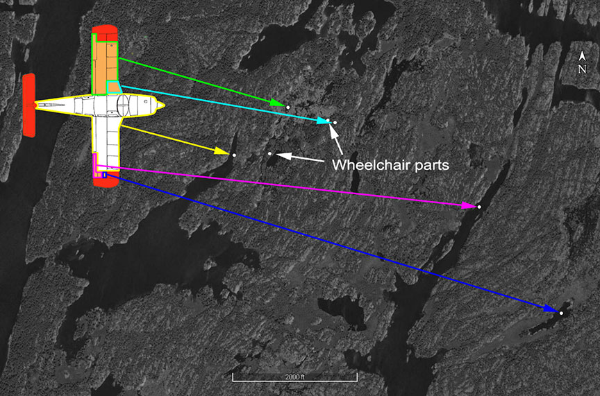 The aircraft sections shown in orange are those that broke off in flight and were recovered. The sections shown in red are those that broke off in flight but were not recovered.