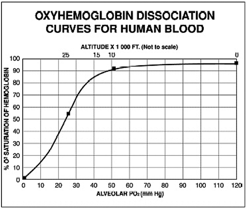 The oxyhemoglobin dissociation curve (Figure 2) reveals that the saturation of hemoglobin with oxygen drops significantly and rapidly above 10 000 feet (3000 metres) asl. Individuals who have a reduced PaO2 even when on the ground due to illness and are then exposed to a further reduction in aircraft cabin pressure at altitude may be brought to the steep part of the oxyhemoglobin dissociation curve. As a result, they may have very low hemoglobin oxygen saturation, which would cause them to experience distress and exacerbation of their underlying illness.Footnote 21