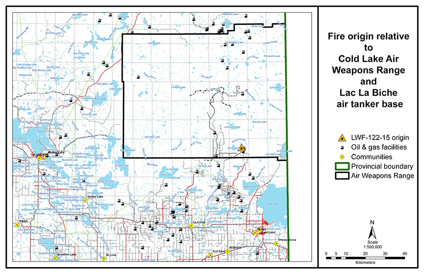 On 22 May 2015 at approximately 1450 Mountain Daylight Time,Footnote 1 a forest fire was reported in the Cold Lake Air Weapons Range (CLAWR). The fire was designated LWF-122-15 by the Wildfire Management Branch of the Alberta government, which then dispatched initial attack crews from the Beaver Lake Staging area and air tanker groups from the Lac La Biche tanker base. The Lac La Biche Wildfire Management Area (WMA) is one of the 10 WMAs in the province of Alberta. The CLAWR is located in this WMA, where the Wildfire Management Branch is responsible for wildfire administration and operations. Access to the CLAWR, however, is managed by the Department of National Defence (DND) to ensure that there is no conflict between civilian and military aircraft. Fire LWF-122-15 was located east of Burnt Lake near the southern border of the CLAWR, where there is also extensive oil and gas infrastructure and development (Figure 1).
