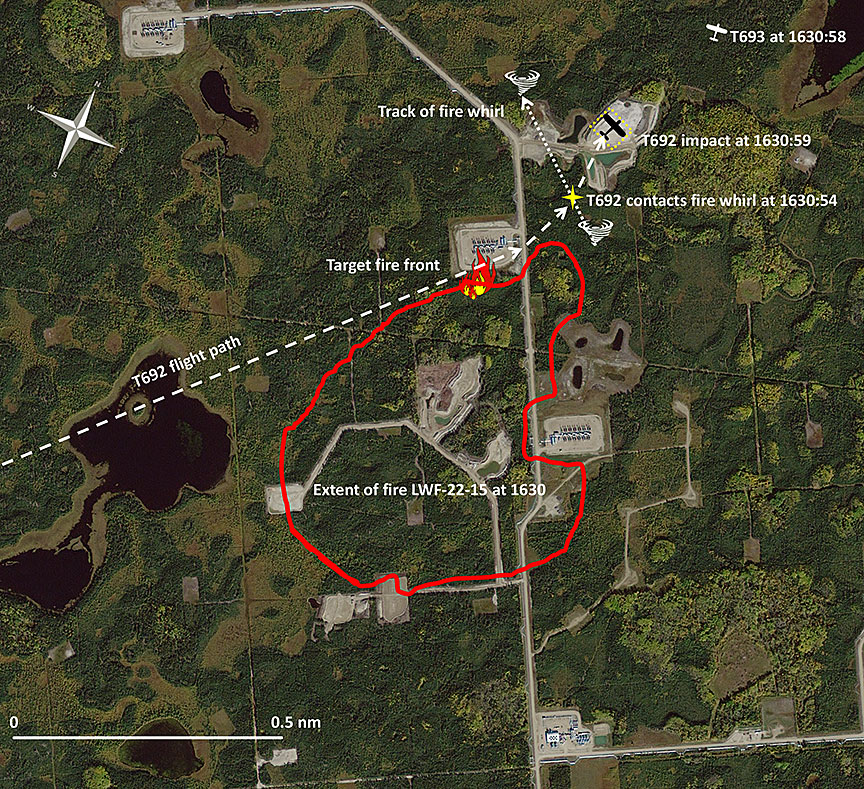 The first aircraft on the scene at approximately 1537 was Bird Dog 130 (BD130), a Rockwell Turbo Commander TC-690 fixed-wing aircraft. It was joined by Tankers 204 and 202 (T204 and T202, Canadair CL-215T aircraft) and Tanker 453 (T453, Convair CV580). T453 dropped a line of retardant to the east of the fire to stop its advance. T204 and T202 were attacking the fire front under the direction of the air attack officer in BD130. T453 returned to Lac La Biche to reload with retardant, while T204 and T202 continued dropping water that they were scooping from Burnt Lake, approximately 2 nautical miles (nm) west of the fire. The fire was exhibiting extreme fire behaviour, growing rapidly and changing direction often. T204 and T202 had established a left-hand circuit, scooping from Burnt Lake and conducting drops on the fire. BD130 was established in an orbit 300–500 feet above ground level (agl) around the fire. The tankers were conducting their drops at a specified bombing height of approximately 150 to 200 feet agl. The Alberta Air Attack Fire Bombing Procedures Manual 2015 defines the specified bombing height as the height in feet agl where the tanker is to release the load. This height is generally 125 feet agl but is adjusted to account for weather, visibility, wind, and terrain conditions. After the drop, the aircraft climb back up to the circuit height of approximately 1000 feet agl.