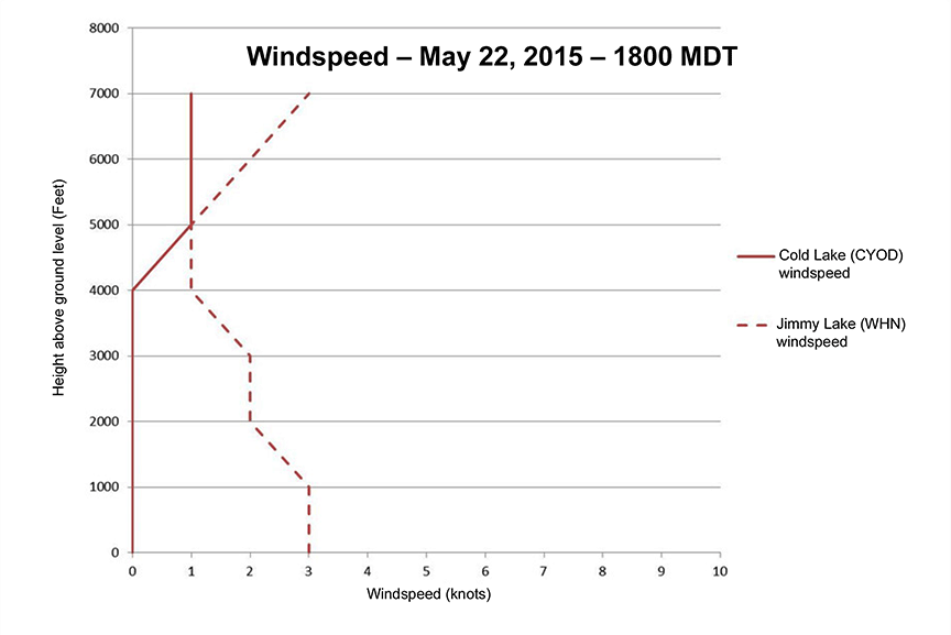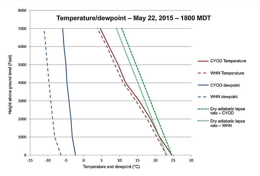 DND gathers meteorological information, including atmospheric soundings, at several locations in the area. The locations closest to the accident site were Jimmy Lake (WHN), 15 nm east of the site, and CYOD, 25 nm south. Figure 3 and Figure 4 show the data gathered from an atmospheric sounding taken at 1800 on the day of the occurrence. The lapse ratesFootnote 3 at both WHN and CYOD are indicative of an unstable atmosphere. The upper wind at both locations was 3 knots or less through to 7000 feet agl.