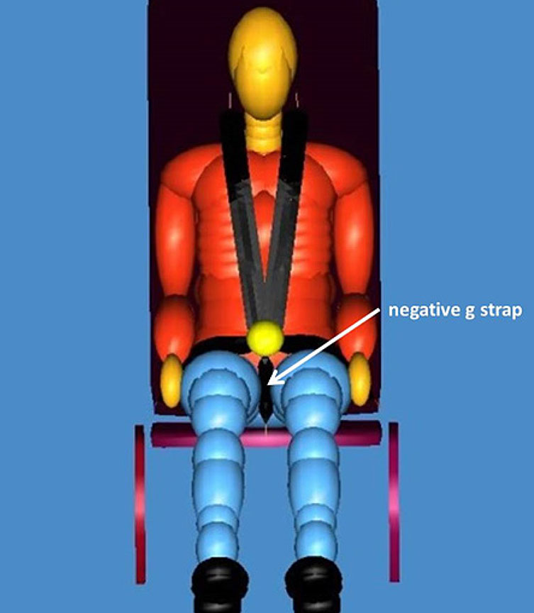 The study concluded that the tests demonstrated that incorporating a negative g strap reduced the tendency toward torso submarining during forward-facing impact, improved occupant seat coupling during free fall, and improved vertical impact protection.