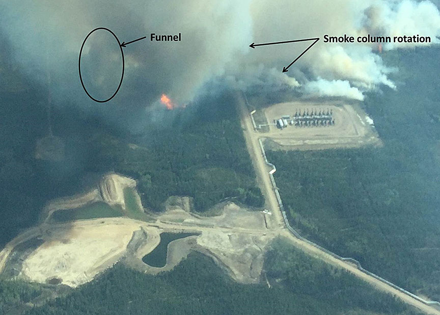 The low-to-moderate ambient winds allow the rotation to organize and grow without being dispersed. In studies of prescribed burns by the Ontario Ministry of Natural Resources, McRae and FlanniganFootnote 15 found that windspeeds above 5.4 knots suppress most fire-whirl development on flat terrain.