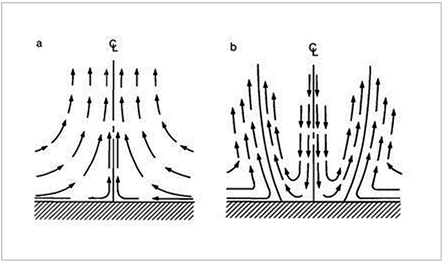 The “L-shaped heat source in cross flow” is seen when the fire forms lines at an angle of approximately 90°. This can occur at the edge of an open area or along road intersections or fire breaks. The air flows into the lines of fire and crosses. The interaction of this flow and the blocking effect of the corner create the rotation (Figure 7).