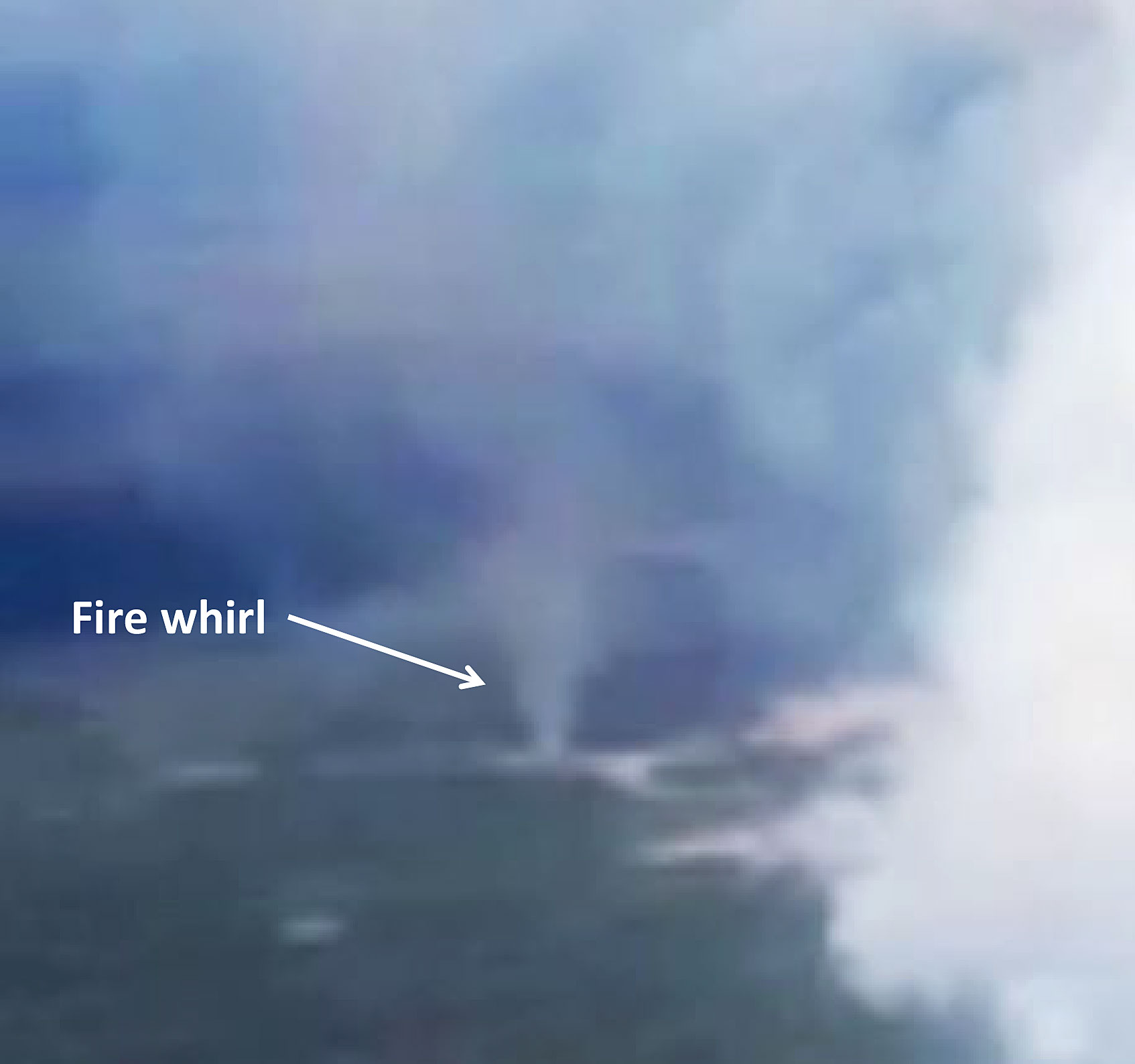 Immediately after the accident, a large fire whirl was seen moving from southeast to northwest across the borrow pit west of T692. The fire whirl was approximately 50–100 feet wide at the base and extended to an altitude of approximately 1500 feet agl. It had a very strong rotation and uptake of material. The fire whirl continued across the borrow pit and re-entered the treeline, where another fire was ignited by debris it was carrying. It then disappeared from view shortly after entering the trees.