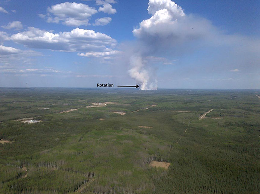 When the atmosphere is unstable, parcels of air can continue moving more easily than in stable conditions. This increases the intensity of the rotation of a column of rising air by stretching it and reducing its diameter. To conserve angular momentum, the rotation increases. An unstable atmosphere is characterized by a high adiabatic lapse rate, fair weather cumulus clouds, and good visibility. CountrymanFootnote 14 described how these conditions affect the smoke column from the fire. The smoke column rises rapidly to a considerable height, initially well defined (Photo 2) and subsequently spreading out. The smoke column may also show signs of rotation, if present (Photo 3).