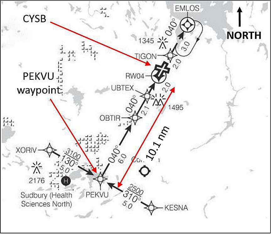 At CYSB, the same runway surface serves as both Runway 04 and Runway 22; its designated number is determined by the direction of takeoff or landing (Appendix A). Runway 22 was the active runway Footnote 3 when POE533 was approaching CYSB from the south. However, the North Bay controller, Footnote 4 who was located at the Toronto Area Control Centre (ACC), authorized POE533 to fly direct via the PEKVU initial approach waypoint. PEKVU is located at 10.1 nautical miles (nm) final on the area navigation (RNAV) approach Footnote 5 to Runway 04, and is situated on the extended runway centreline for departures from Runway 22 (Figure 1 and Appendix B).