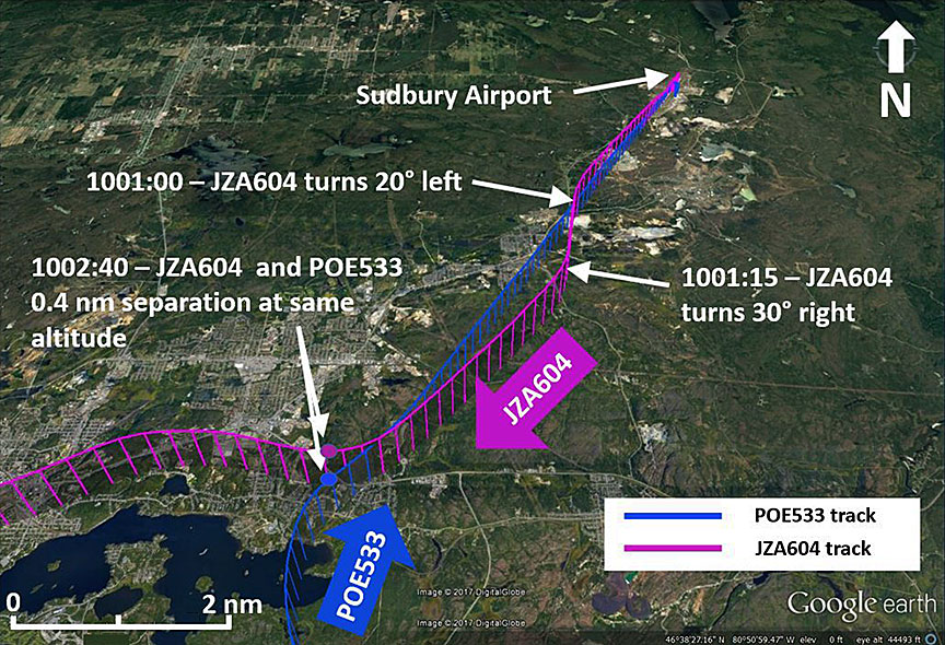 On 14 October 2016, a Porter Airlines Inc. de Havilland DHC-8-402 aircraft (registration C GKQA, serial number 4357), operating as flight 533 (POE533), was conducting an instrument flight rules flight from Toronto/Billy Bishop Toronto City Airport, Ontario, to Sudbury Airport, Ontario. A Jazz Aviation LP de Havilland DHC-8-402 aircraft (registration C-GXJZ, serial number 4523), operating as flight 604 (JZA604), was conducting an instrument flight rules flight from Sudbury Airport, Ontario, to Toronto/Lester B. Pearson International Airport, Ontario. POE533 was inbound to Sudbury Airport from the south, with a clearance for a visual approach. JZA604 had taken off from Sudbury Airport under visual flight rules and was heading south. At 1002:21 Eastern Daylight Time, when both aircraft were about 9.5 nautical miles southwest of Sudbury Airport, at approximately 4000 feet above sea level, both flight crews received a resolution advisory from their respective traffic alert and collision avoidance systems. Both flight crews took evasive action, and radar data indicated that the 2 aircraft came within 0.4 nautical miles of each other at the same altitude.