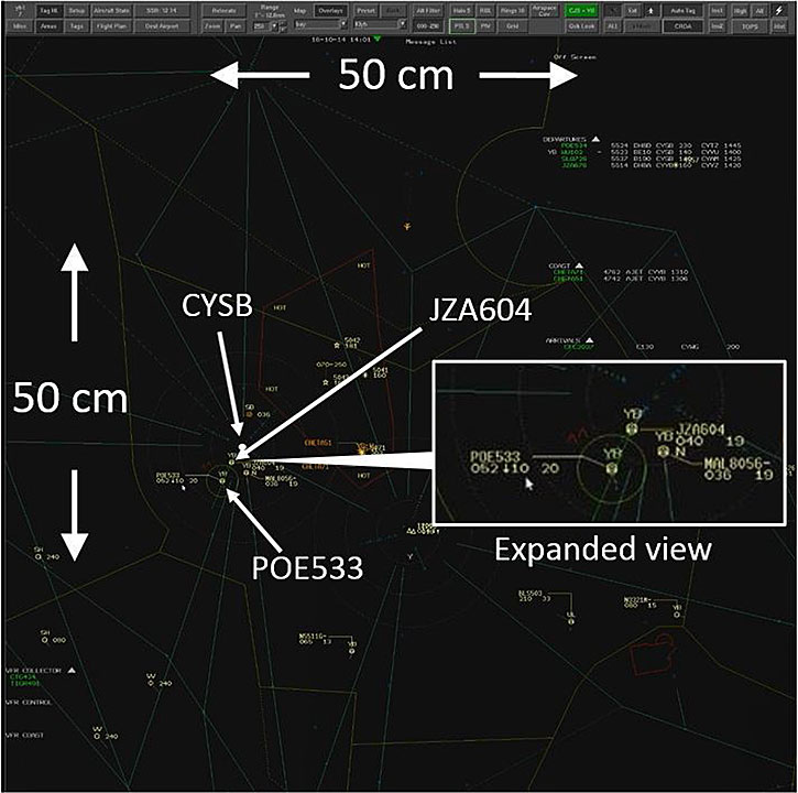 At the time of the occurrence, the CSiT used by the North Bay controller displayed altitude information for both POE533 and JZA604, along with their present-position symbols. Given the large area of the North Bay Sector, the CSiT range was set to 250 nm, whereby 1 cm of screen resolution was equal to approximately 5 nm. This setting enabled the controller to see the entire sector (Figure 3). However, if a target makes a small heading change while the range is set to this scale, it will not be immediately apparent on the screen.