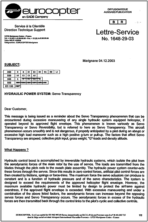 There have been a number of accidents in the past involving servo transparency on AS 350–series helicopters. In 2003, the manufacturer issued a service letter to address concerns that operators and pilots did not fully understand the phenomenon of servo transparency. The service letter described it as something that was not dangerous if properly anticipated during abrupt or aggressive manoeuvres.