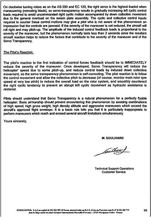 A number of accidents involving servo transparency on AS 350–series helicopters have occurred (Appendix A). Due to concerns that operators and pilots did not fully understand servo transparency, on 04 December 2003, Eurocopter published 2 service letters as reminders to operators and pilots of the phenomenon of servo transparency. One service letter (No. 1648-29-03) concerned AS 350–series helicopters (Appendix B) and the other (No. 1649-29-03) concerned Colibri (EC120B) series helicopters. In 2006, the information contained in service letter No. 1648-29-03 was incorporated into the AS 350 BA Flight Manual (Appendix C). It is unknown whether the contents of the service letter, or the applicable section of the flight manual, were covered during the pilot's initial training on the AS 350.