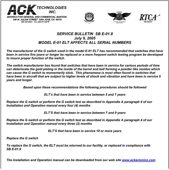 Appendix D – ACK Technologies Inc. Service Bulletin SB E-01.8