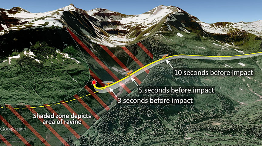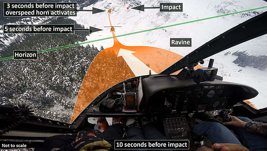 As the helicopter approached the rising terrain on the other side of the ravine, approximately 3 seconds before impact, the pilot applied aft cyclic control stick and attempted to turn left, away from the terrain ahead. However, the pilot was unable to move the cyclic control stick to the left. The helicopter then pitched up and, as it did so, its main rotor became aerodynamically overloaded and over-sped, activating the helicopter's main rotor high-rpm (revolutions per minute) warning horn. It experienced an uncommanded roll to the right and entered an uncontrolled descending right turn, which continued through approximately 180° of heading change (Figure 1 and Figure 2).
