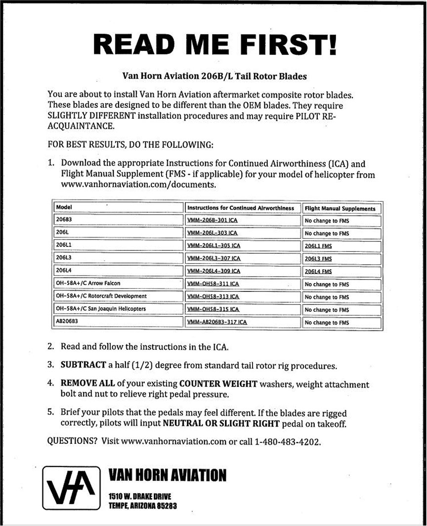 Van Horn blades are constructed of carbon fibre skins over a structural foam core and have a stainless-steel leading-edge abrasion strip. The blades are of nearly the same dimensions as the OEM blades, but are somewhat lighter and have a different airfoil and tip shape. Van Horn promotes its blades as being thinner, quieter, and more efficient than the OEM blades, and describes them as producing "reduced pedal forces."Footnote 3 In the company's FAA-approved documents for installation and maintenance of the blades, the Instructions for Continued Airworthiness state that "the blades have lighter pedal forces in flight."Footnote 4 The "READ ME FIRST!" document (Appendix A) states, in part,