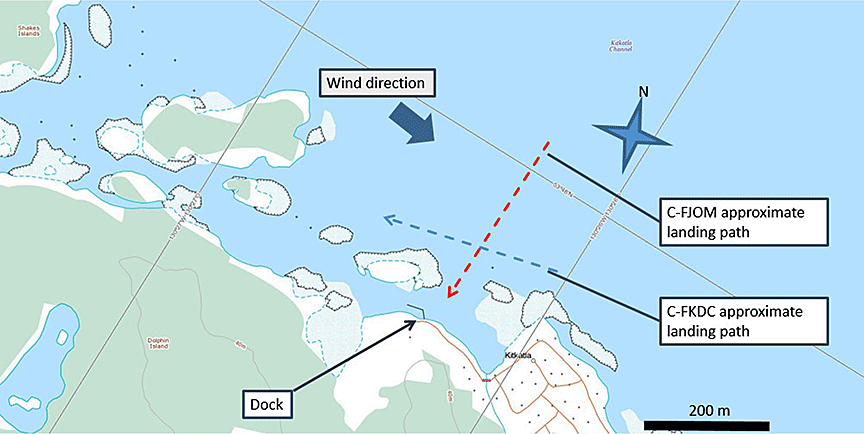 The pilot of C-FJOM determined that the wind and water-surface conditions at Kitkatla were suitable for a crosswind landing, and carried out an approach directly toward the shoreline and dock (Figure 1). The aircraft touched down approximately 200 m from shore.