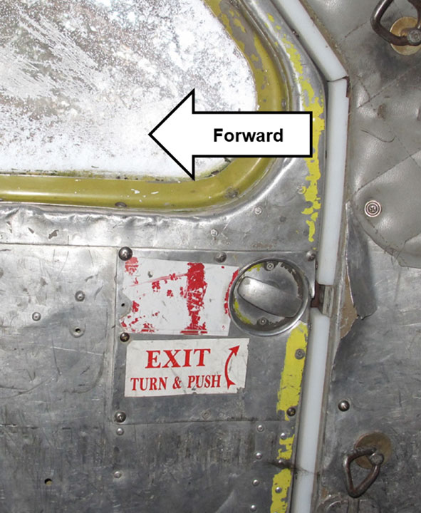 The interior handle on the main cabin doors is located near the aft edge of the door, immediately below the window. The handles are most easily accessed by passengers sitting in the rear sling seat. All of the aircraft's interior door handles (Figure 4) consist of a short metal bar mounted in a shallow circular recess. Occupants open the cabin doors by rotating the bar with their thumb and fingertips. Because the aircraft is usually positioned such that the dock is to its left side, the doors on the right are rarely used. Inland Air did not require that passengers physically open and close the doors as part of the safety briefing, and the passengers on the occurrence flight did not do so.