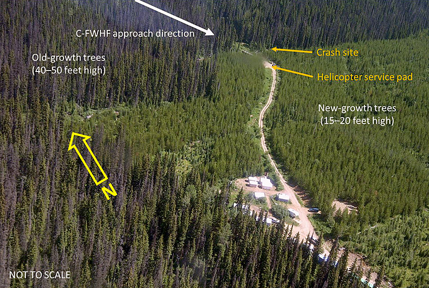 The helicopter approached from the north, over old-growth trees on terrain that descended toward the service pad, which was surrounded by new-growth trees. The pilot then intended to execute a 180° turn back to the service pad.
