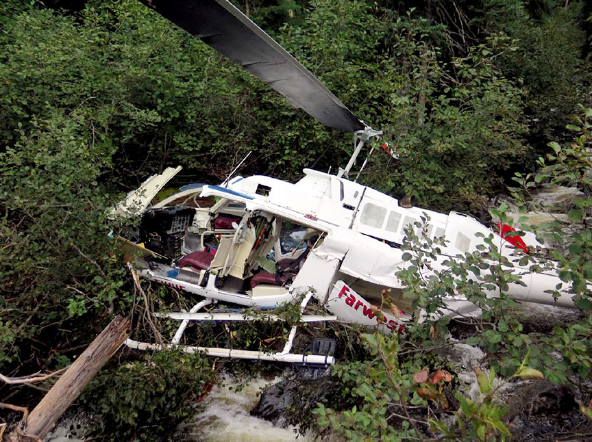 After about 2 complete rotations during the descent, the helicopter collided with terrain among the older-growth trees. It came to rest straddling a small boulder-strewn creek, approximately 200 feet from the service pad. The emergency locator transmitter activated and emitted signals on 121.5 megahertz (MHz) and 406 MHz that were detected by overflying aircraft and Cospas-Sarsat,Footnote 4 respectively.