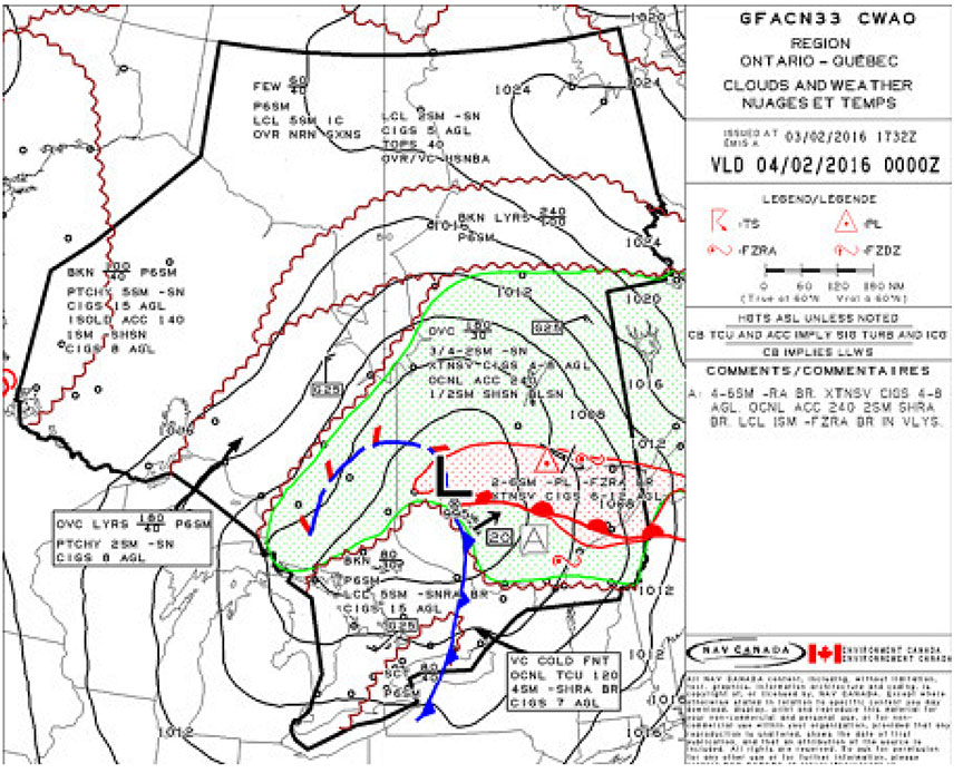 The clouds and weather chart issued at 1232, and valid at 1900, showed a low-pressure system located over southwestern Quebec, moving northeastward at 20 knots. See Appendix B for the clouds and weather charts issued on the occurrence date.