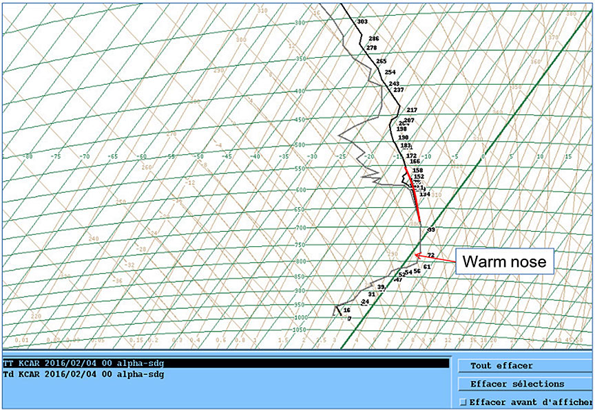 By 1900 on 03 February 2016, the low-pressure system was located over western Quebec and the warm front had moved slightly northward. Three aerodromesFootnote 11 were reporting ice pellets mixed with light snow, and the surface winds were still east-southeasterly ahead of the warm front.