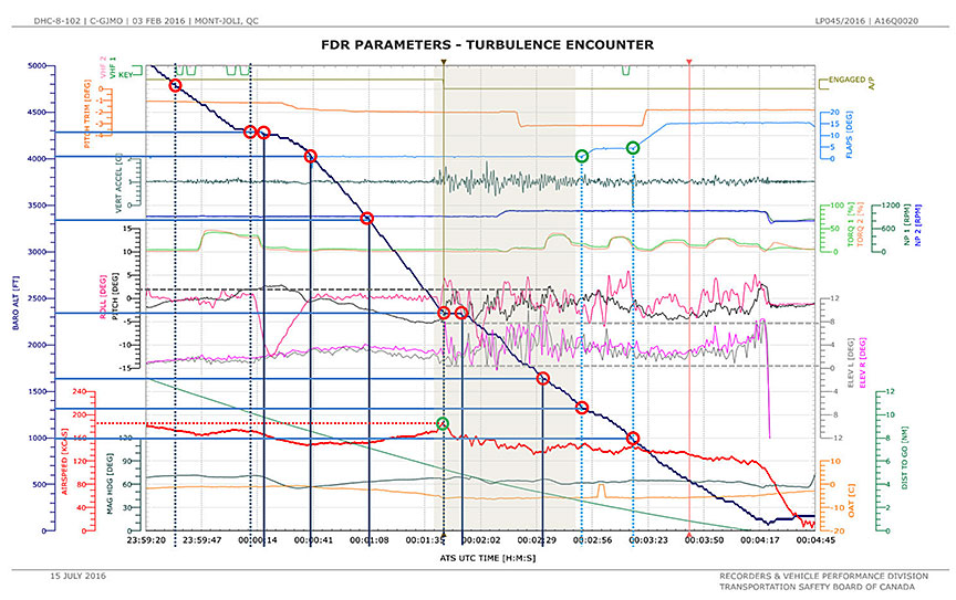 The FDR data also confirms the sudden onset of moderate turbulence followed by immediate aircraft response to the elevator input to level the aircraft at 2340 feet. The FDR data further established that