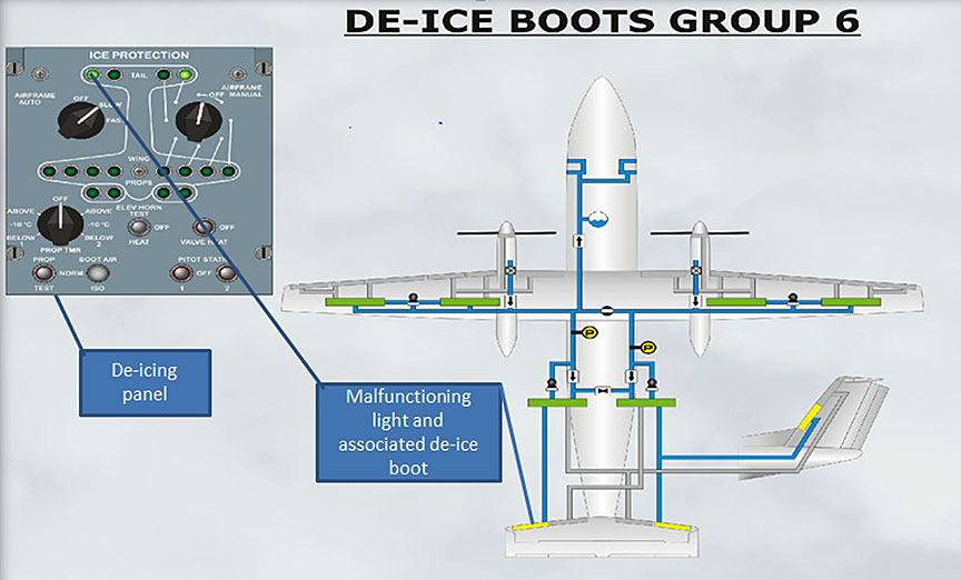 The crew controls de-icing boot inflation via automatic or manual mode, and can monitor boot inflation by observing a series of green advisory lights, installed within a diagram of the aircraft located on the overhead panel (Figure 1). An illuminated green de-ice boot advisory light on the ice protection panel indicates that the associated boot is fully inflated.