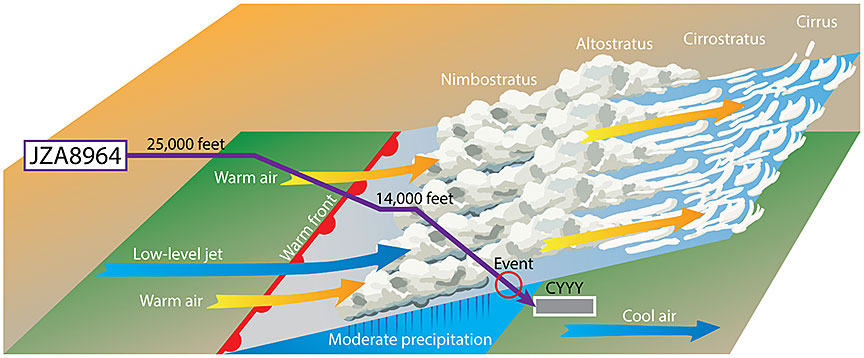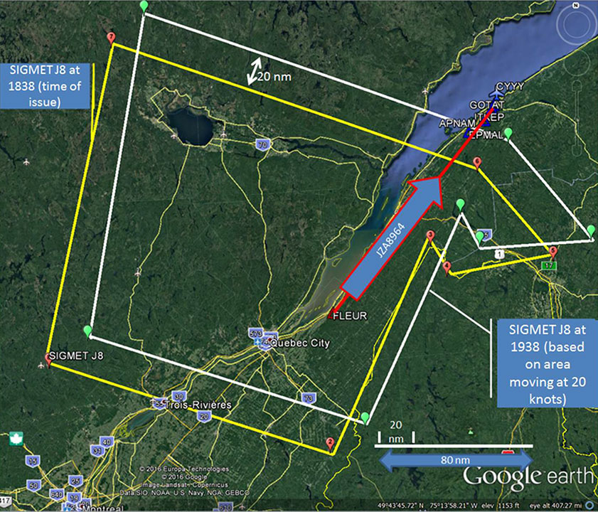 At 1843, the Montréal Area Control Centre controller enquired if the crew was aware of significant meteorological information (SIGMET)Footnote 4 J8, advising of an area of freezing rain and severe icing below 6000 feet above ground level (AGL) in an area 30 nm west of CYYY. The PM replied that they had seen the area on the graphical area forecast (GFA).