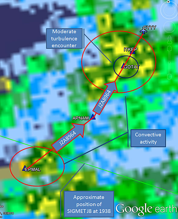 At 1856, Mont-Joli Radio asked JZA8964 if they were aware of SIGMET J8, to which the crew replied that they were. Two minutes later, Mont-Joli Radio broadcasted SIGMET J8, in both French and English, over the mandatory frequency.