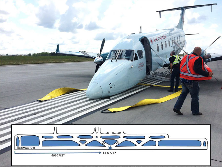 At 0717, GGN7212 was on final approach to Runway 35R and was switched from the control tower frequency to the emergency frequency. A few minutes later, at about 300 feet above ground level (AGL), the captain instructed the passengers to brace. At 0720, GGN7212 touched down on the main landing gear. The first officer feathered both propellers,Footnote 3 placed both engine condition levers in the fuel cut-off position, and pulled both FIRE PULL/T handles.Footnote 4 About 20 seconds later, the nose touched the runway. The aircraft slid on its nose for another 20 seconds before coming to a stop 6950 feet from the runway threshold (Figure 2). Emergency vehicles reached the aircraft in 30 seconds, and all passengers and crew deplaned within 1 minute.