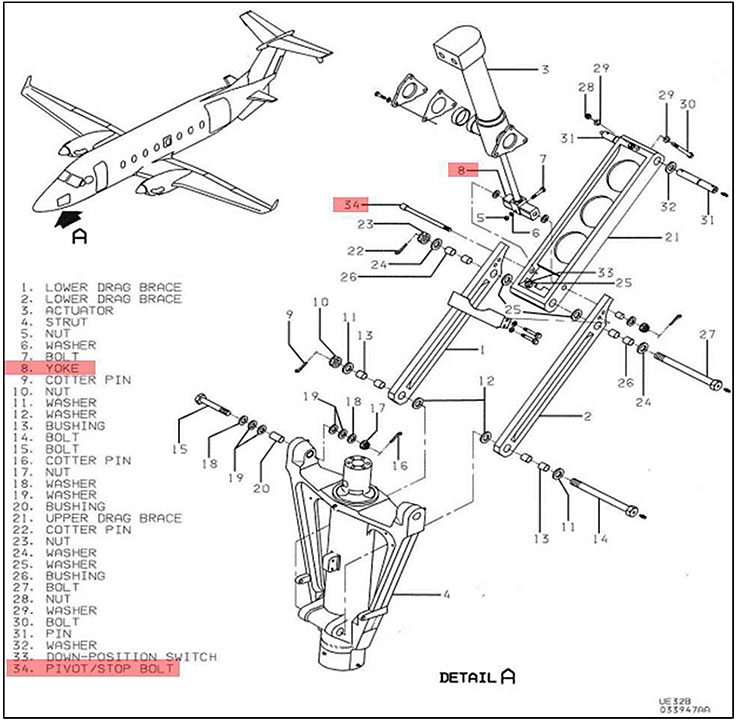 The Beechcraft Corporation Model 1900D Airliner Maintenance ManualFootnote 5 describes the 1900D as equipped with a retractable tricycle landing-gear system. The nose and main landing‑gear assemblies are extended and retracted by a hydraulic system consisting primarily of an actuator located in each wheel well, a hydraulic power pack located in the left wing, and hydraulic plumbing. During extension and retraction, the nose gear actuator exerts pressure through an aluminum yoke fitting attached to the end of the actuator piston (Figure 3). This yoke is attached to the middle of the upper and lower drag braces, and causes the drag braces, when folding or unfolding, to extend or retract the nose gear. The yoke (item 8 in Figure 3) is attached and pivots through the braces by means of a pivot/stop bolt, part number 114-820107-1 (item 34 in Figure 3).