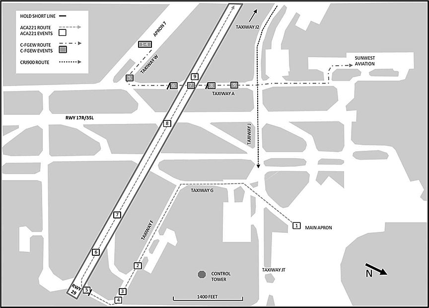 During daylight hours on Friday 02 December 2016, the active runways Footnote 1 at Calgary International Airport (CYYC), Alberta, were parallel runways 17L (left) and 17R (right), and 4 controller positions were open in the control tower: west tower, east tower, east ground/apron, and west ground/clearance delivery.