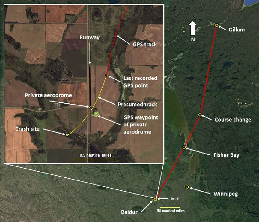 The aircraft departed CYGX at 1550 and climbed to 9000 feet above sea level (ASL) on a direct track to CYWG. At 1715, when the aircraft was approximately 174 nm from CYWG, the pilot altered course to a southwest heading that would take him directly to the private aerodrome.