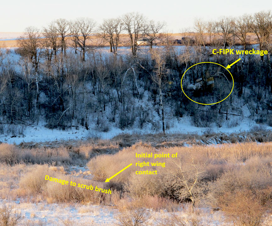 The right wing contacted scrub brush roughly 8 feet from the marsh surface (Figure 3). Damage to the scrub brush indicates that the aircraft was in a 5° descent while banking approximately 23° to the right.