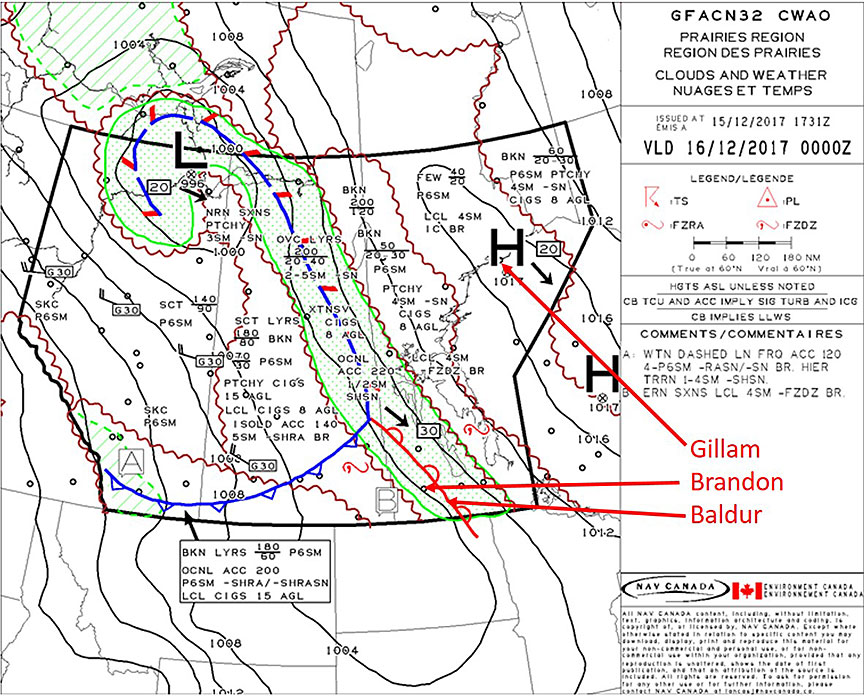 The weather at CYGX at the time of the aircraft's departure was reported as clear sky conditions, light winds, temperature of −26°C and an altimeter setting of 29.92 in. Hg. The forecast weather, available at the time of departure and based on the graphical area forecast, indicated that extensive ceilings of 800 AGL with visibility of 2 to 5 sm in light snow with occasional visibility of ½ sm were expected for the Baldur area (Figure 4).