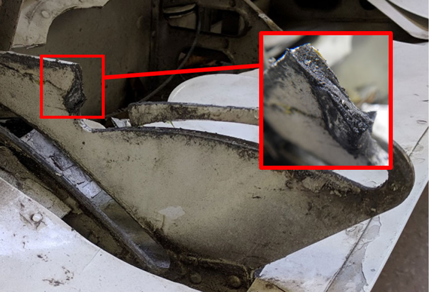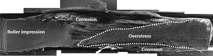 The fractured surface of the inboard flap track was examined with a scanning electron microscope. It was determined that the damage was caused by corrosion, which gave the appearance of delamination (Figure 2). The corrosion had been present prior to the occurrence; however, when or how it began could not be determined. Corrosion has a detrimental effect on the strength of an aluminum component and can significantly diminish the structural integrity and life expectancy of an aircraft component.