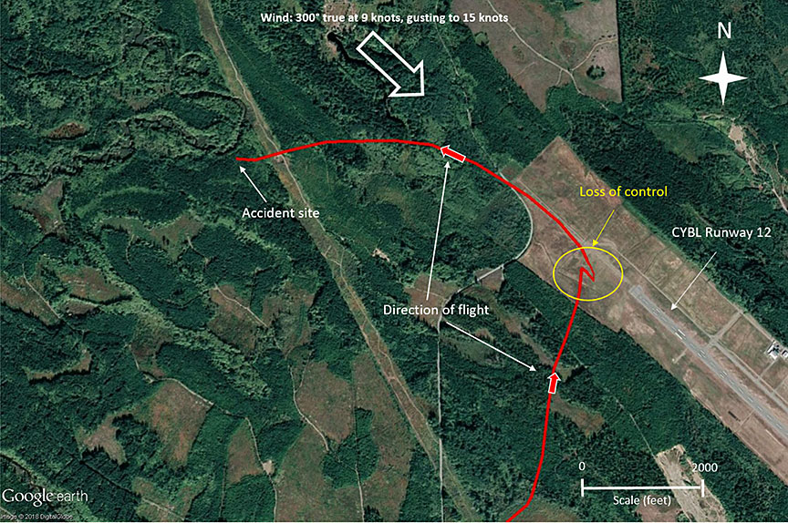 The aviation routine weather report (METAR) for CYBL at 1500 indicated the following: winds 300° true (T) at 9 knots, gusting to 15 knots, varying from 270°T to 340°T; visibility 30 statute miles; few clouds at 4000 feet AGL; temperature 18 °C; dew point 5 °C; and altimeter setting 30.14 inches of mercury.