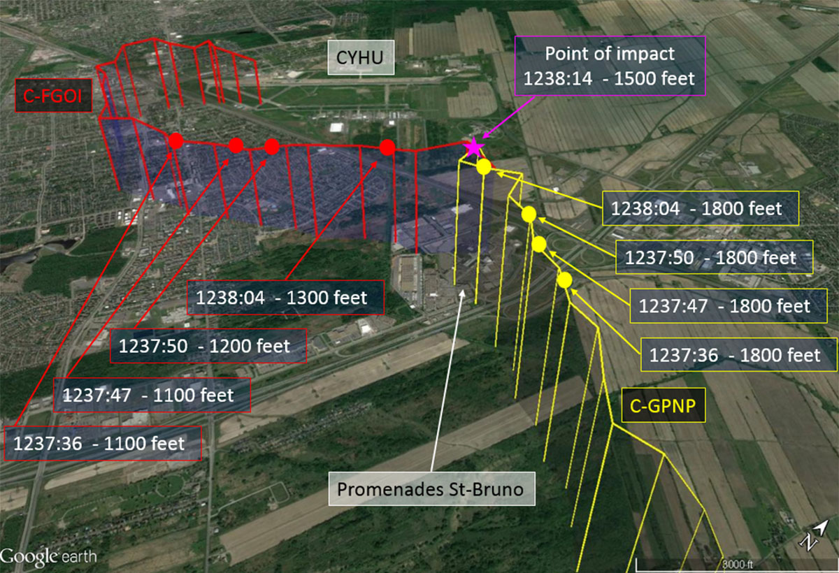 Radar altitude readouts for both aircraft were lost at 1238:10; however, their radar targets remained displayed.Footnote 5 The tower controller made a final call to C-GPNP at 1238:14, at which time the distance on radar separating C-GPNP and C-FGOI was less than 0.1 nm. The 2 aircraft had already collided at approximately 1500 feet ASL,Footnote 6 above the Promenades St-Bruno shopping mall, 1.7 nm east-southeast of CYHU.