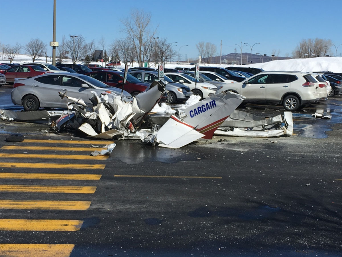 C-FGOI came to rest in the parking lot of the same shopping mall, near a main entrance and restaurant. Several cars parked near the wreckage sustained minor damage after being struck by parts of the aircraft that separated from the main wreckage on impact. There were no injuries to bystanders.