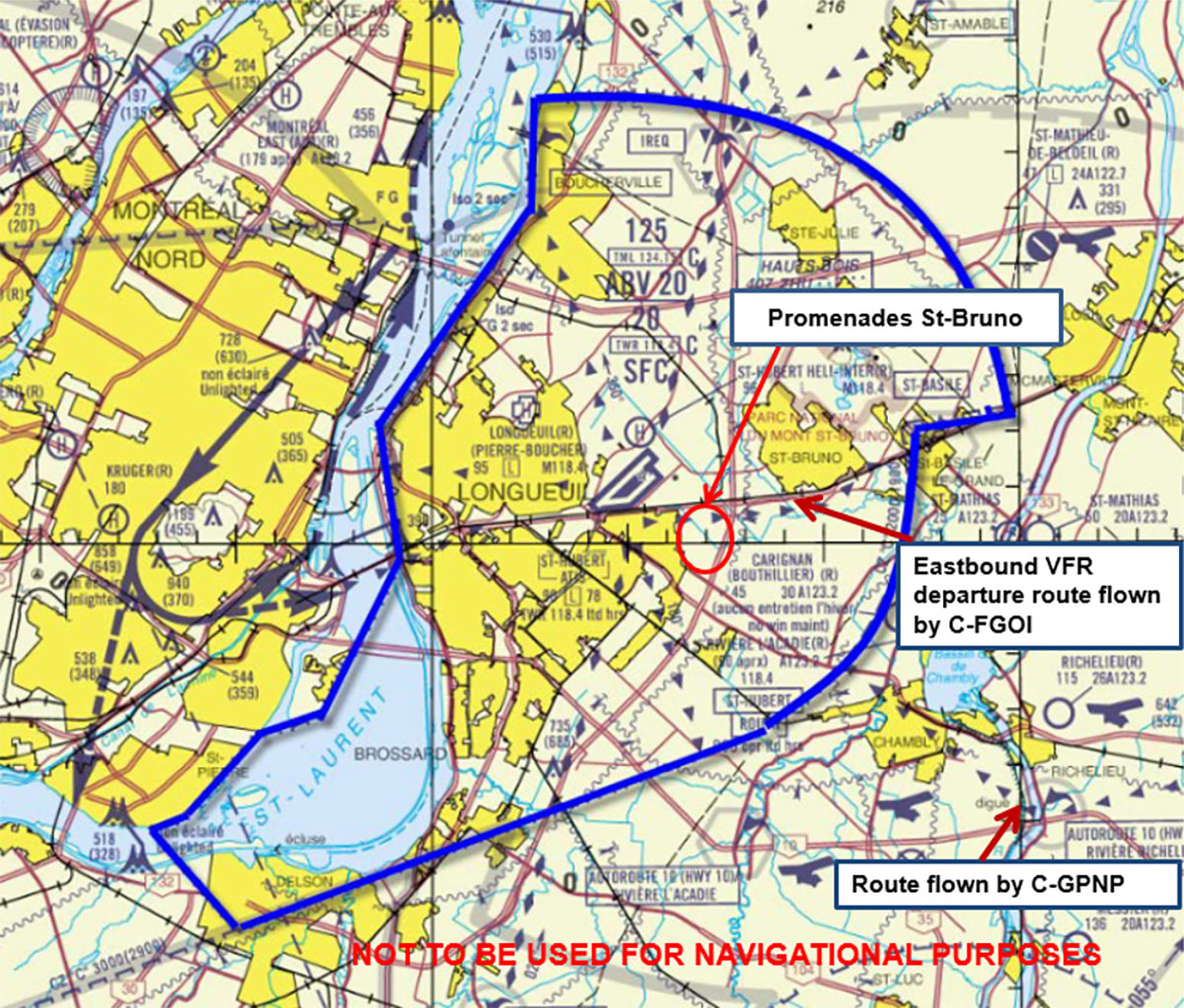 Both aircraft were operating under visual flight rules in controlled airspace, and air traffic control had issued altitude restrictions to each aircraft: C-GPNP had been instructed to maintain an altitude of “not below 1600 feet” and C-FGOI had been instructed to maintain an altitude of “not above 1100 feet.” The relative attitudes of the 2 aircraft suggest that when the pilot of C GPNP became aware of the impending collision with C-FGOI, which was approaching from the left, he made a right turn in an effort to avoid it. Neither pilot saw the other aircraft in time to avoid a mid-air collision, partly owing to the inherent limitations of the see-and-avoid principle.