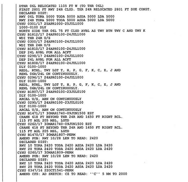 Of the 37 NOTAMs regarding CYHU, 8 were related to airfield construction, and the NOTAM on the runway width reduction was the 16th on the list. The same NOTAM indicated that, for aircraft with a wingspan greater than 78 feet, 48 hours' notice was to be given to airport authorities. N888ZJ's wingspan was greater than 78 feet, so this NOTAM applied. However, as stated in Section 1.10.3 of this report, there is nothing to indicate that such a notice was provided to CYHU airport authorities. The information gathered indicates that the flight crew incorrectly believed that only the length of the runway, and not the width, had been reduced.