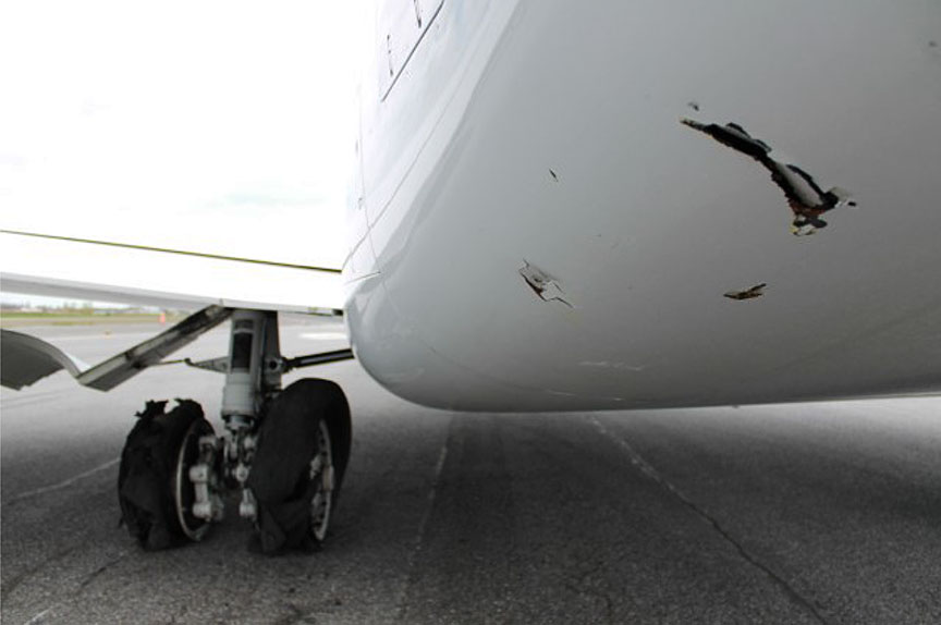 Although debris from the tires was sucked into the left engine, damage was limited to 2 punctures in the acoustic panel surrounding the engine inlet area.