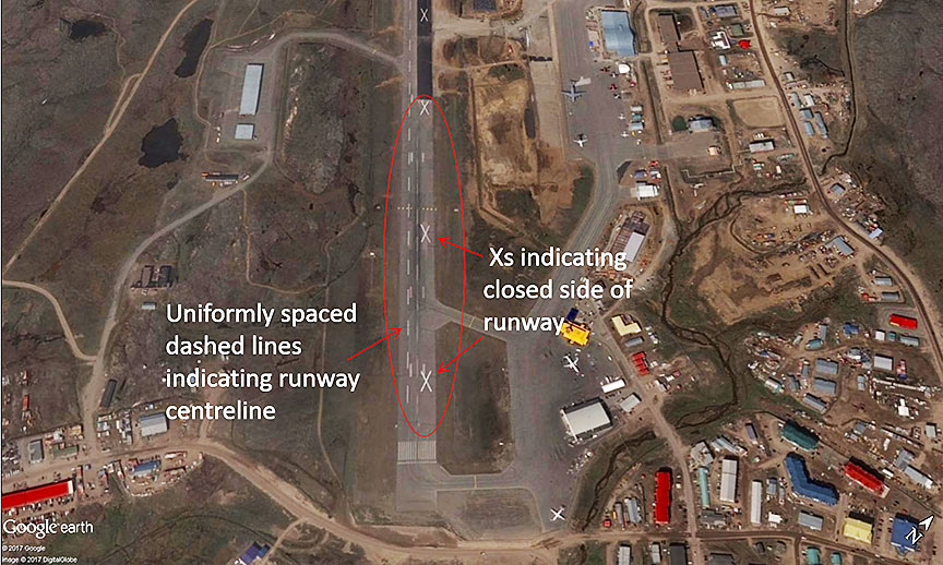 In 2015, Iqaluit Airport (CYFB), Nunavut, underwent work similar to the work at CYHU. The width of the runway was reduced along the entire length of the runway. White Xs indicated the closed side of the runway, and the centreline of the runway had been marked with uniformly spaced dashed lines (Figure 6).