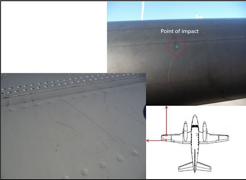 The damage was limited to a dent at the point of impact on the left wing de-icing boot, as well as scratches on the upper surface of the left wing (Figure 2). The damage was minor and had no effect on the airworthiness of the aircraft. The aircraft was returned to service the same day.