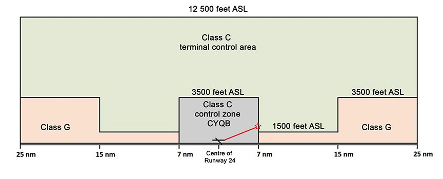 CYQB is located within Class C controlled airspace, which means that all aircraft must obtain authorization from air traffic control (ATC) before entering this airspace. Class G airspace is an airspace within which ATC has neither the authority nor the responsibility to exercise control over air traffic. The collision took place within the Class C control zone (Figure 3).